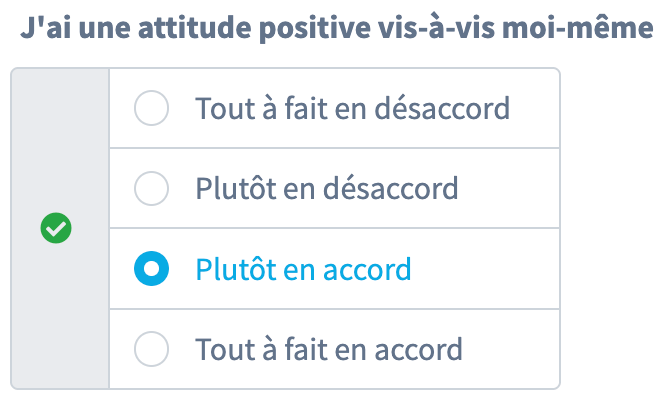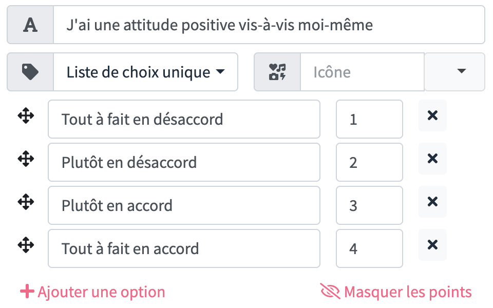 Vous pourrez ainsi, pour chaque question, définir les points à associer à chacune des réponses possibles. Puis, vous pourrez ajouter un champ de type score pour calculer la somme ou la moyenne des points d'une partie ou de l'ensemble des questions. Les scores et les sous-scores de chaque bloc de questions seront ainsi calculés automatiquement. Par exemple, cette nouvelle fonctionnalité peut être utilisées pour créer un questionnaire d'évaluation de l'estime de soi de Rosenberg. Pour chacune des questions, les points sont répartis de 1 à 5 ou inversement. Un champ Score permet de calculer automatiquement la somme de tous points.