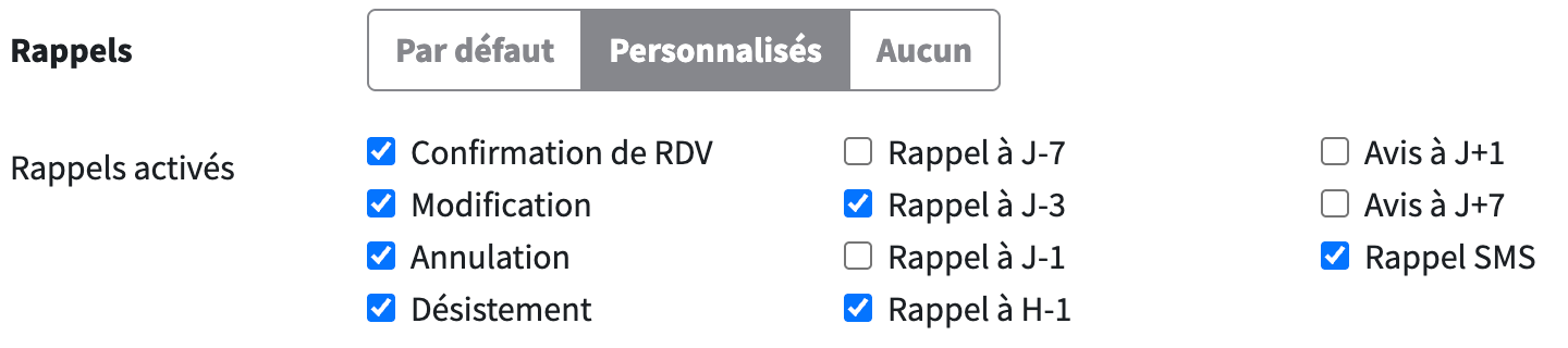 L'envoi des messages de rappels peut maintenant être personnalisé pour chaque catégorie de rendez-vous. Par exemple, vous pouvez décider d'envoyer un message à J+1 pour les séances de suivi, et ainsi demander de laisser un avis sur votre fiche Google Business, mais le désactiver pour la catégorie qui correspont au 1er rendez-vous.